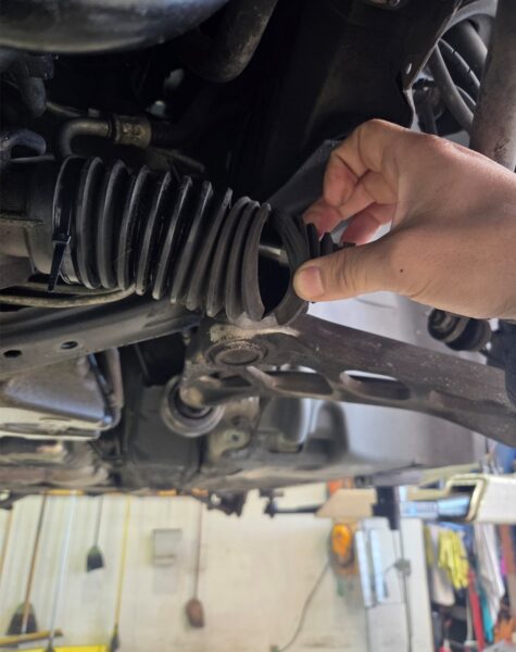 写真:ラックブーツの亀裂を確認した際の様子(車検不適合となる可能性があります)
