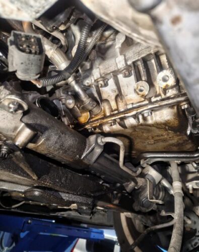写真:エンジンオイルパンから見つかったオイル漏れの様子