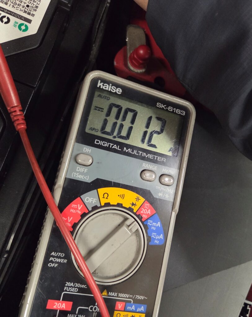 写真左は、電流測定時に撮影したもので、通常であれば作動時に約1.5A程度の電流が通るのですが、ハザード点灯時に約0.01A程度の暗電流が確認されました。