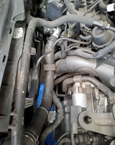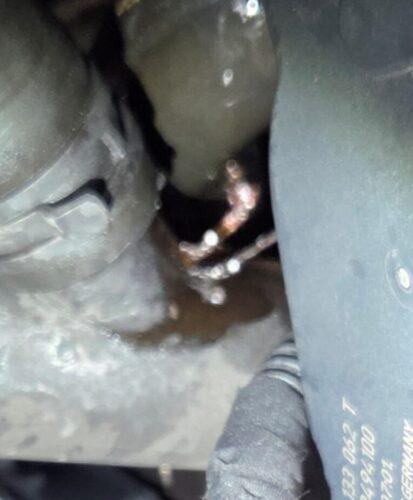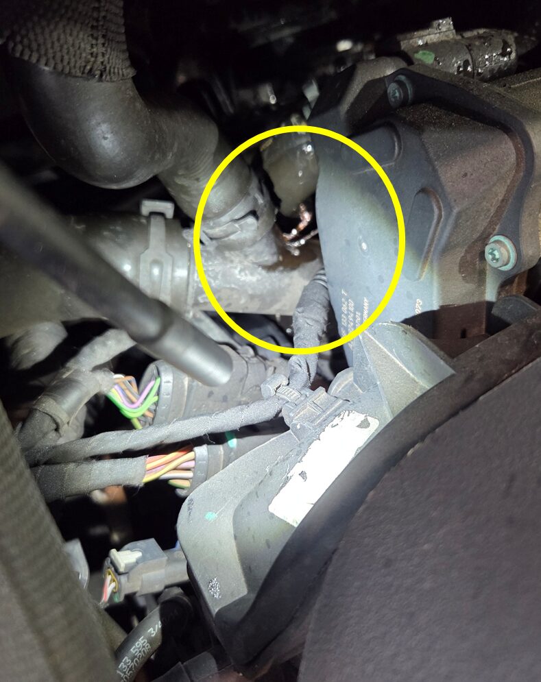 ラジエターとエンジンを繋ぐアッパーホースから三又に分岐している樹脂製のジョイント部の劣化によりヒビが入りそこからクーラントが漏れ出していました