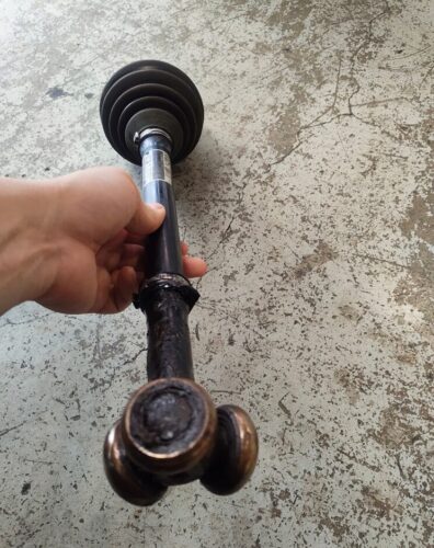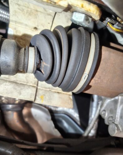 走行中の振動と異音はフロント左側のドライブシャフトブーツ破損によりグリスが漏れ出し内部のベアリングに異常摩耗が発生。これによりクリアランスが拡大しガタツキが振動と異音を出していたと思われます。