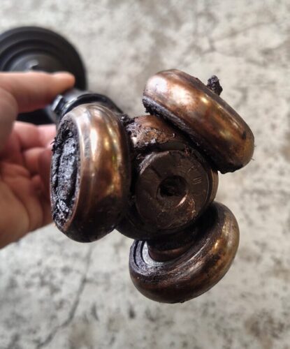 中央はベアリングの拡大ですが、本来シルバー色のパーツですが油膜切れにより焼き付きを起こして変色していました。
