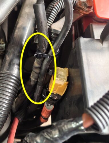 不明の配線の先端を絶縁テープで巻き、他の部分に接触しないようバンドでま束ねました。