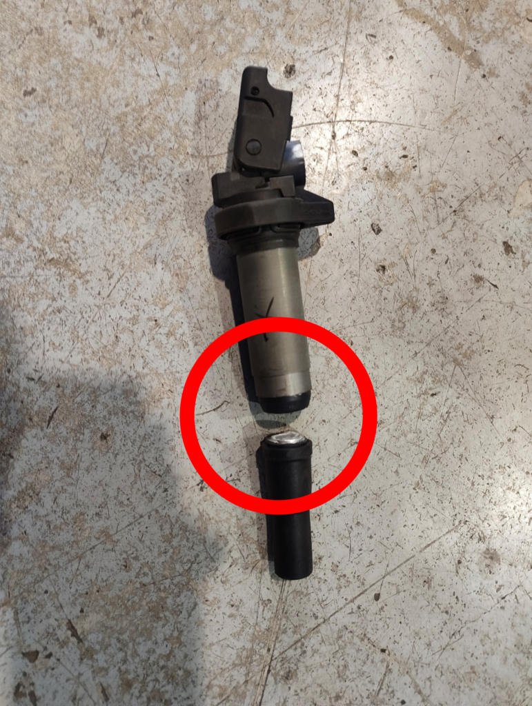 写真左は、点検時に撮影したイグニッションコイルの様子で、赤丸で囲んだ部分を見ると、イグニッションコイルが完全に折れてしまっている状態にあることが分かります。
