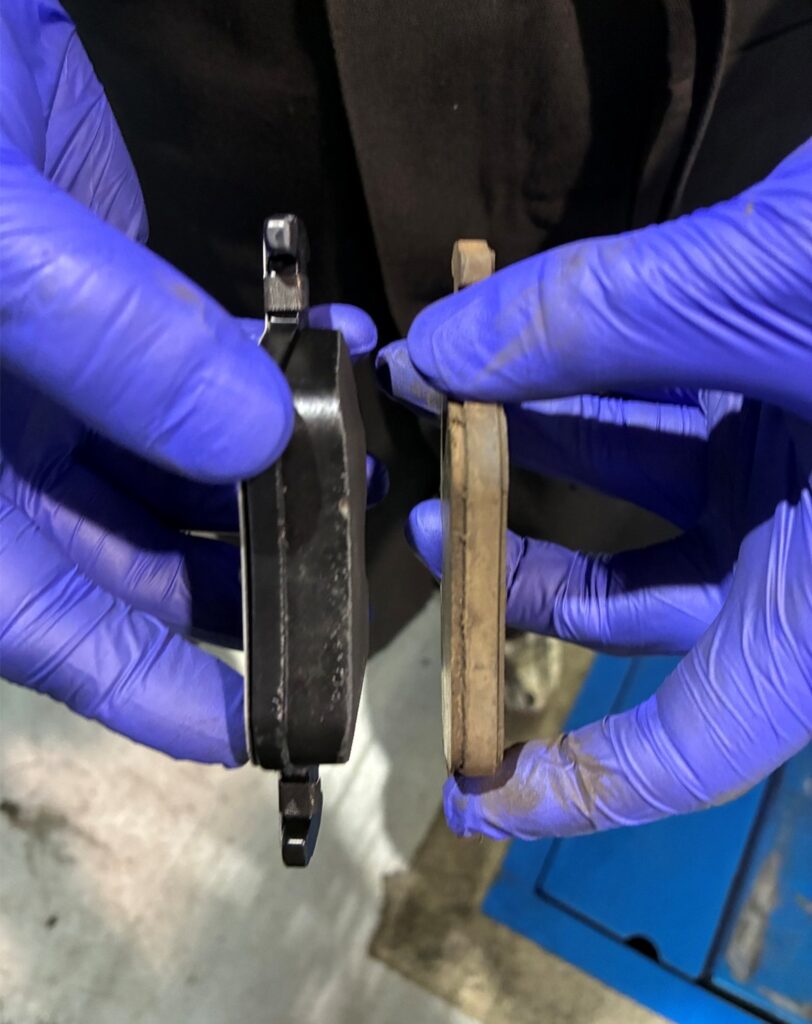 ⑤リアブレーキパッド交換を実施しました。(写真中央、新旧の比較)