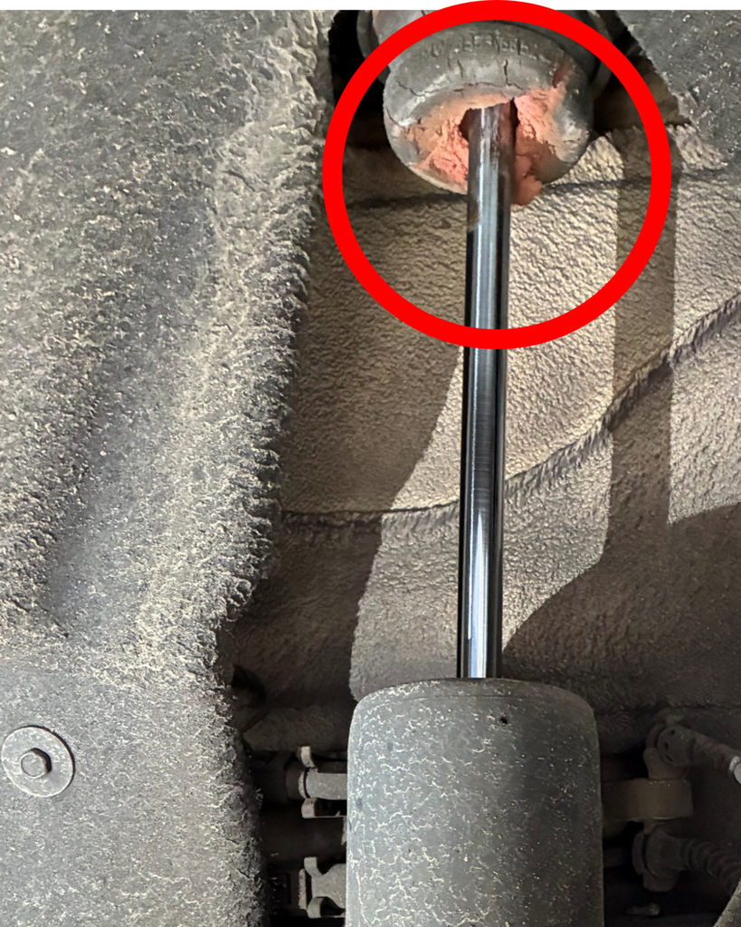 ⑤点検の際に、右リアのショックバンプラバーの劣化(写真左の赤丸で囲んだ部分)が見つかったことから、交換を実施しました。(写真中央、新旧ショックバンプラバーの比較)