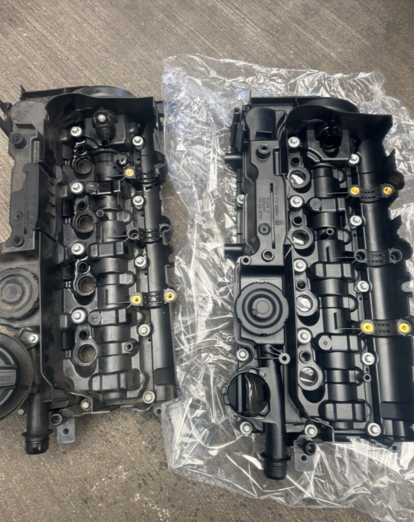 写真左はエンジンヘッドカバーを脱着した際の様子、写真中央は新旧エンジンヘッドカバーの比較です。