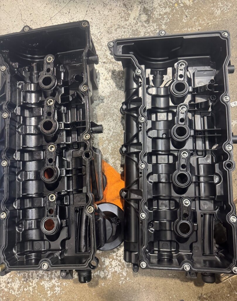 写真中央がエンジンヘッドカバーを脱着している際の様子、写真右が新旧ヘッドカバーの比較です。