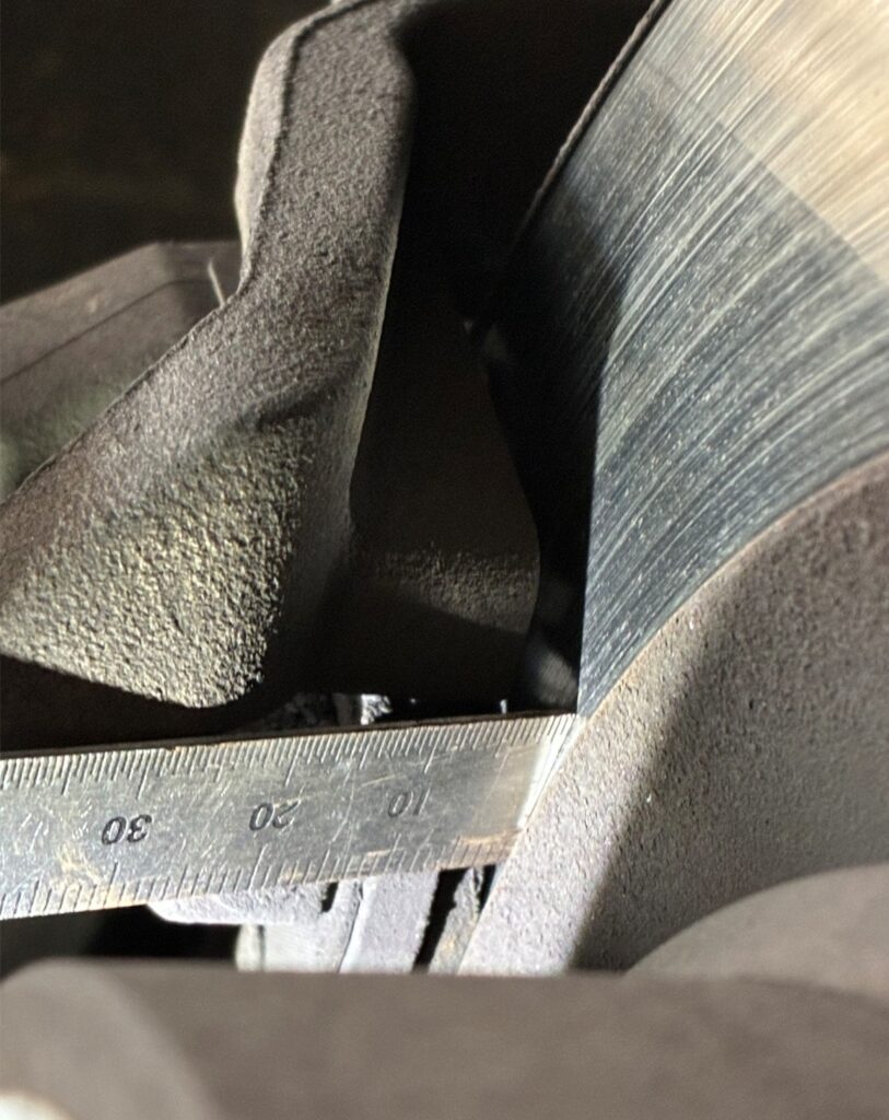 ブレーキ残量測定時の写真を見ると、ディスクローターに木の年輪のような白い模様が、何層にもなっていることが見えますが、これらはすべて摩耗跡です。