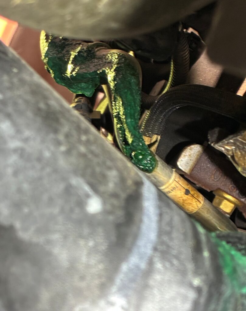 ②冷却水漏れがウォーターホースなどにも垂れていることを確認しました。写真右の緑色箇所が、ウォーターホースに付着した水漏れ跡です。