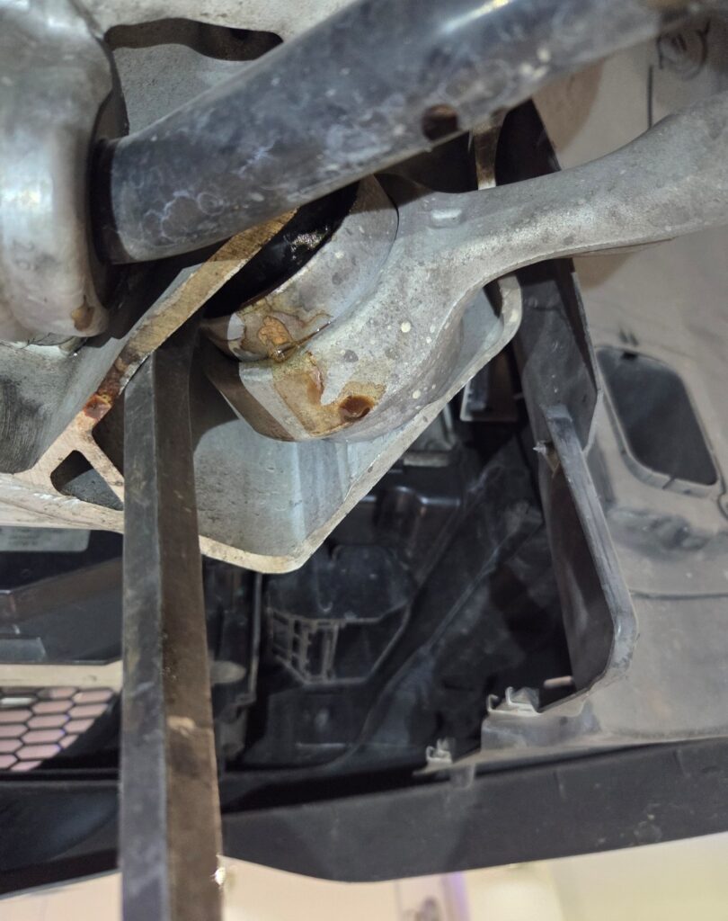 ②フロントのプルストラットブッシュからグリス漏れが確認されたことから、交換を実施しました。
