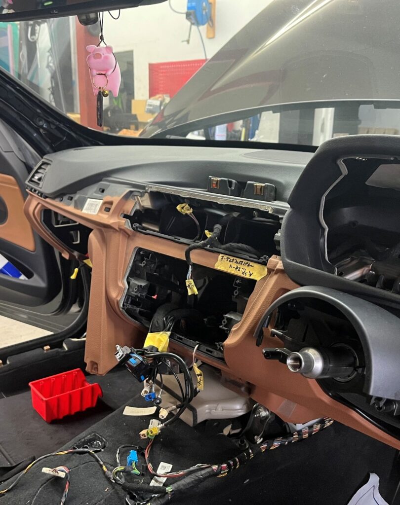 点検の結果、冷却水漏れ等が見つからなかったことから、ヒーターコア本体に問題があることが判明したため、交換のためにダッシュボードの脱着を実施しました。