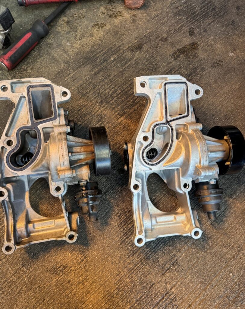 ウォーターポンプとオイルフィルターハウジングからも冷却水漏れが見つかったため、交換を提案させていただき、ご承諾いただいたことから、交換を実施しました。