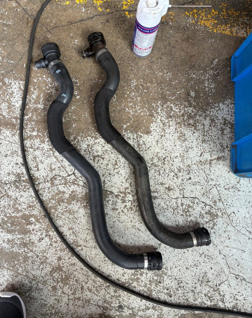 ④エレメントケースとの接続パイプ交換やラジエーターアッパーホースの交換、熱管理モジュールの交換作業を実施しました。