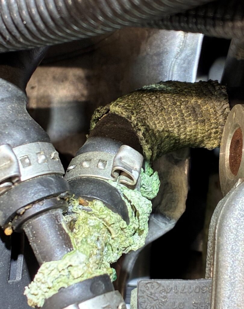 写真左のホースに付着している緑色の塊が、漏れ出して凝固した冷却水です。