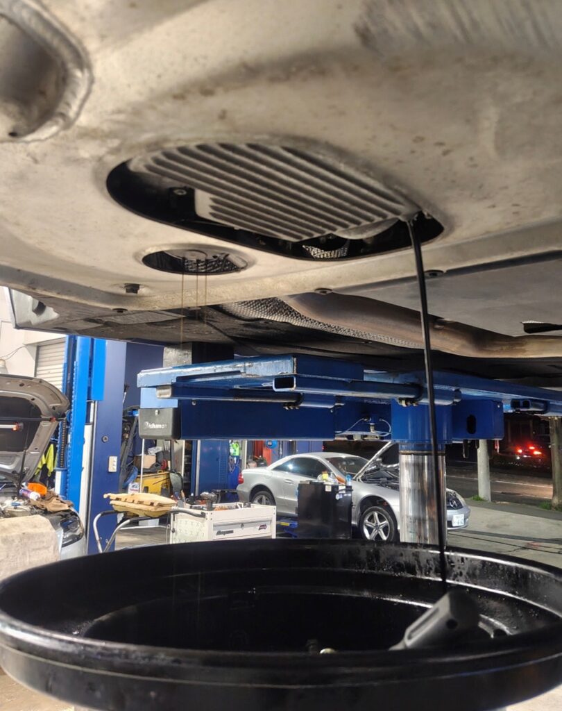 ⑥エンジンオイル・オイルフィルター交換を実施しました。(写真左、エンジンオイル交換作業時の様子)