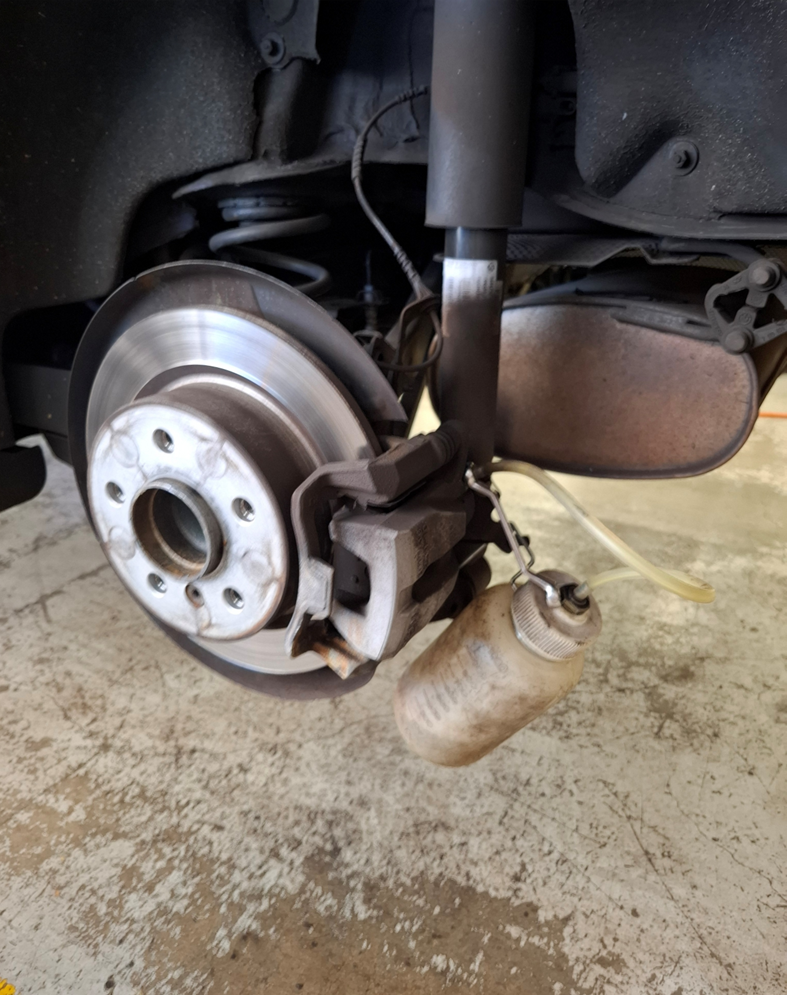 お預かり後に点検を実施。ブレーキフルード交換・エア抜き(写真左と中央)や