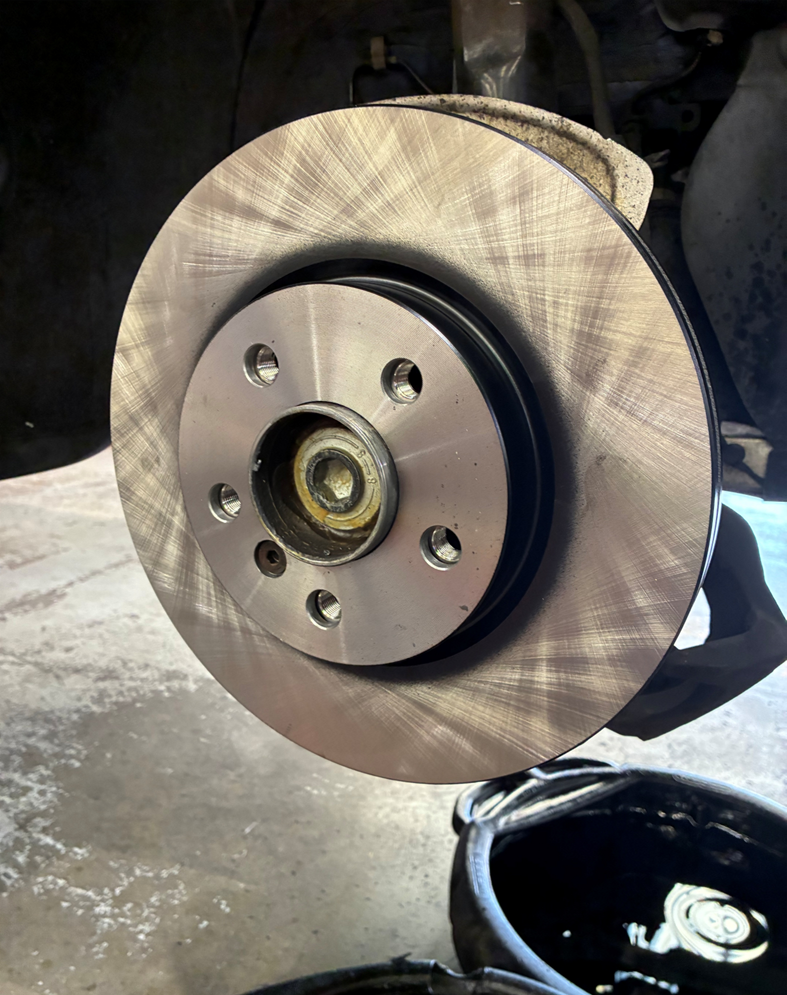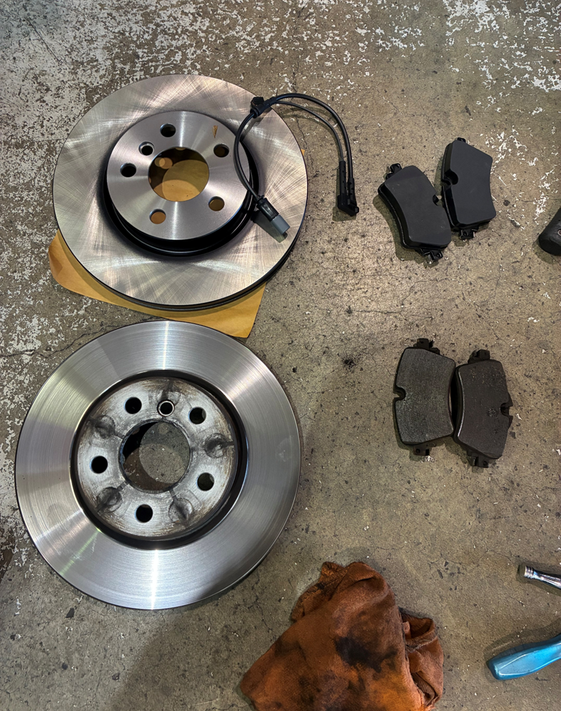 ブレーキパットとパットセンサー・ディスクローターの交換(写真右)、その他にもドレンボルトのガスケットやワイパーブレード交換などの作業を行いました。