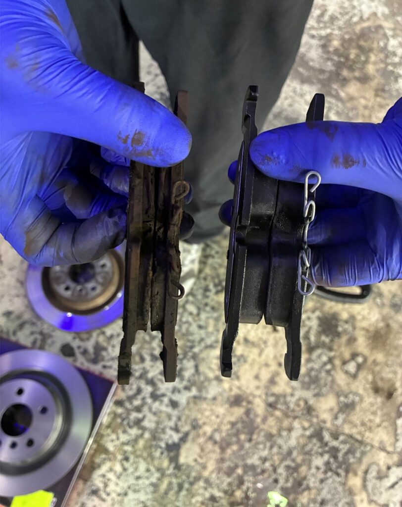 写真中央が新旧リアブレーキパッド、写真右が新旧ディスクローターの比較です。