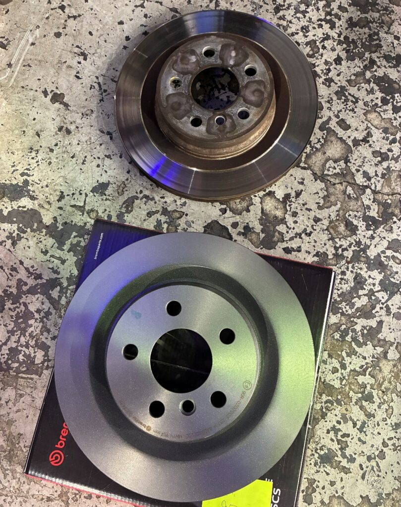 ②リアブレーキパッドの残量低下を確認したことから、交換を提案させていただき、ご承諾いただいたことから、リア側のブレーキパッドとディスクローターの交換を実施しました。