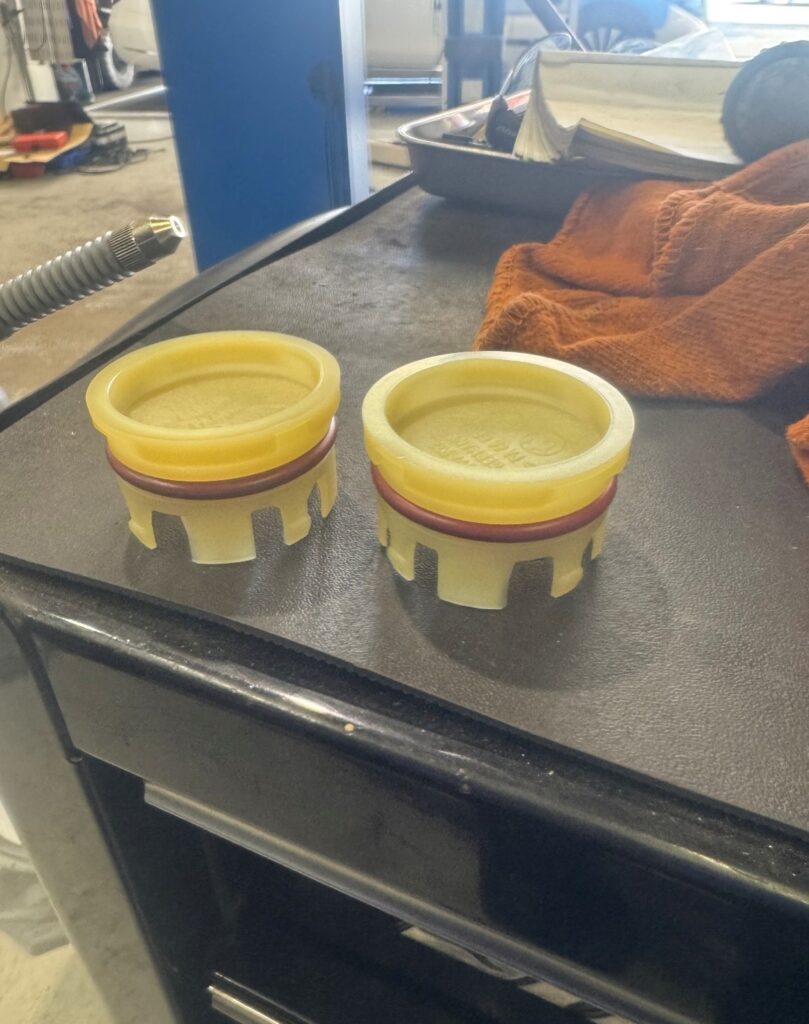 ⑤また、バランスシャフトブラインドキャップの交換(写真右)と、それに伴うインナーフェンダーの脱着作業などを実施しました。