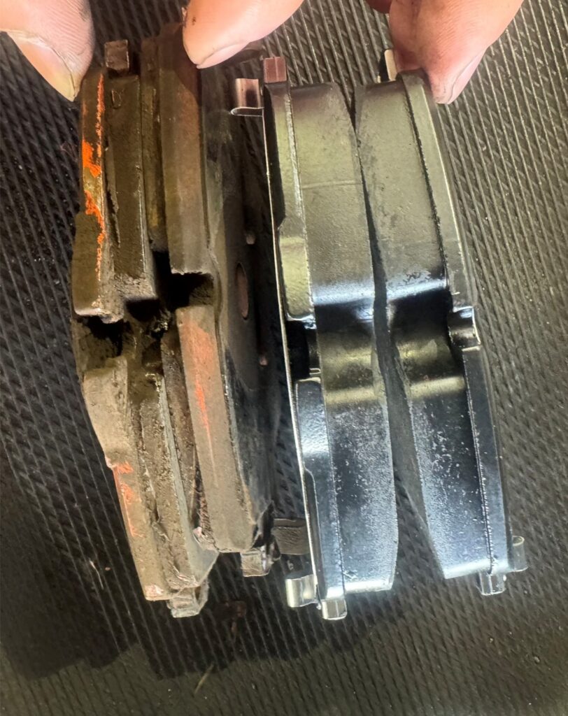 ②フロントブレーキパッド交換を実施しました。(写真中央、新旧パーツの比較)