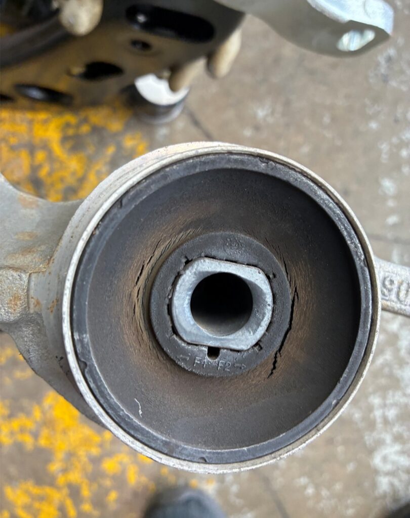 点検の結果、異音に関しては、【ロアアームブッシュのヒビ割れ】が原因でした。