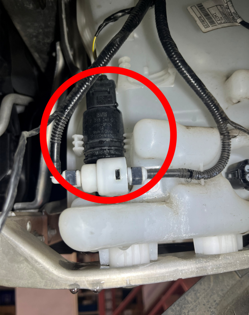 ③ ウォッシャー液漏れに関しては、写真左の赤丸部分にあるウォッシャーポンプから液漏れが発生していることを確認しました。