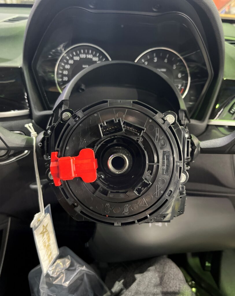 エアバッグなどの動作に関わるレストレイントシステムの警告が表示され、コイルスプリング内の配線が断線したことが原因であったため、交換を実施しました。