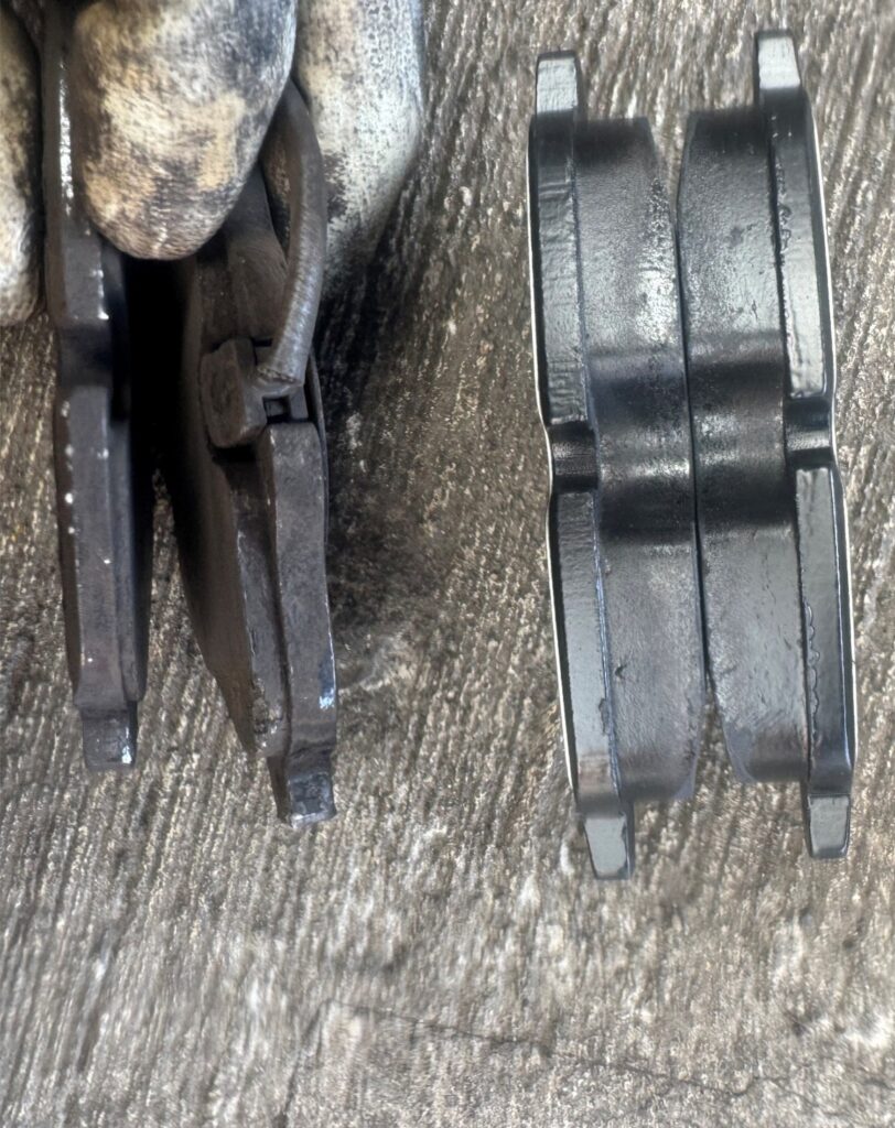 写真中央が新旧ブレーキパッドの比較、写真右が新旧ディスクローターの比較です。