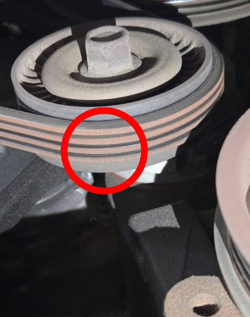 ②写真右赤丸で囲んだ部分、ドライブベルトにヒビ割れが確認されました。
