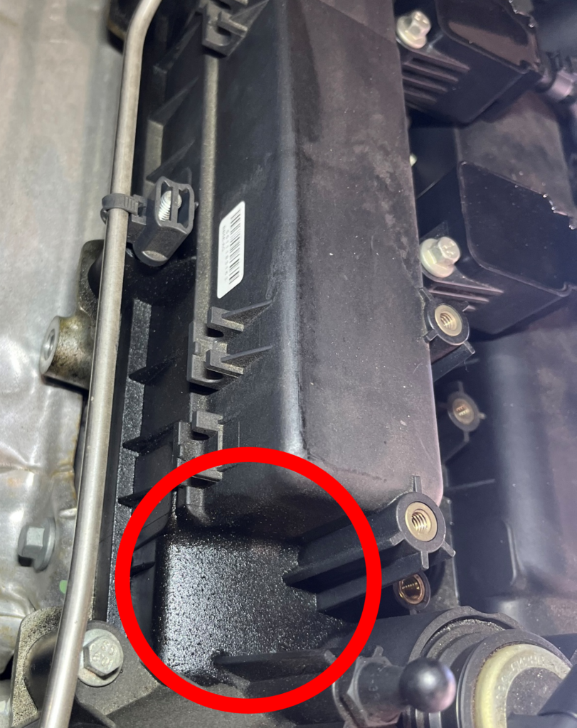 ①写真左の赤丸で囲んだ部分、エンジンヘッドカバー本体よりオイル滲みを確認しました。