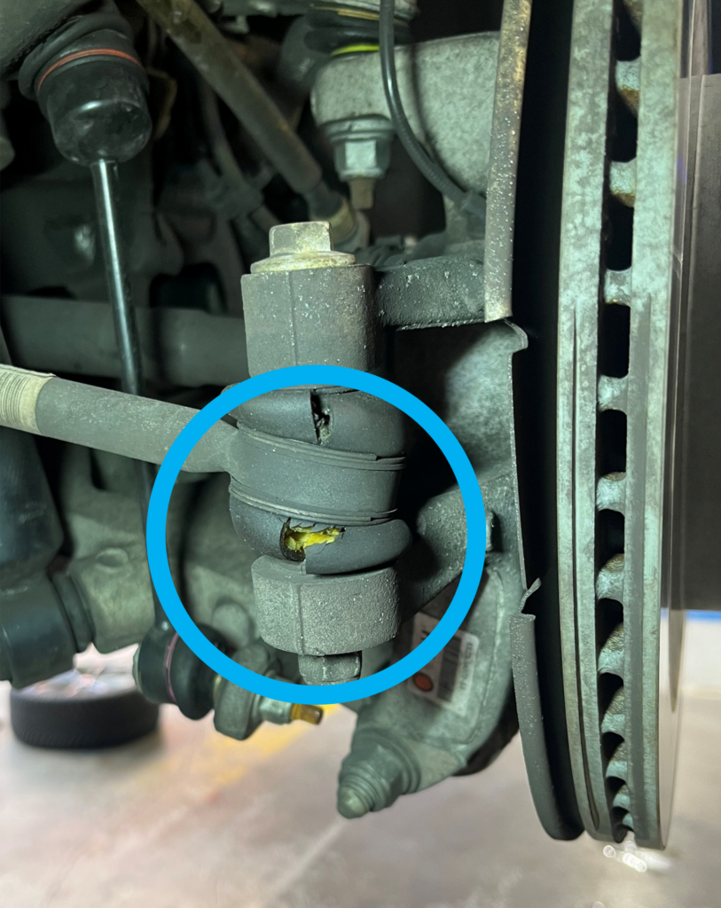 ③写真右のフロント左側コントロールアームブッシュに亀裂が見つかりました。
