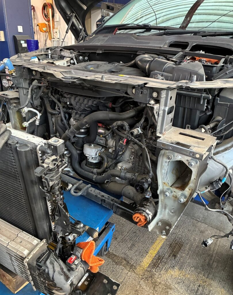 ①。ラジエーターからの水漏れが確認されたことから、インナーフェンダーやバンパーなどを脱着したのち、ラジエーター交換を実施しました。