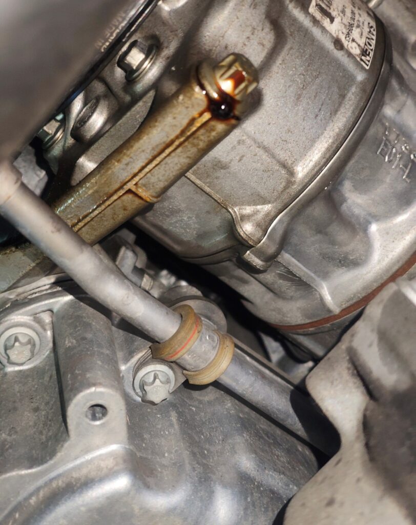 ②点検時にフューエルホースからのオイル漏れを確認しました。写真中央がオイル漏れの様子で、オイルが滴っているのが確認できます。