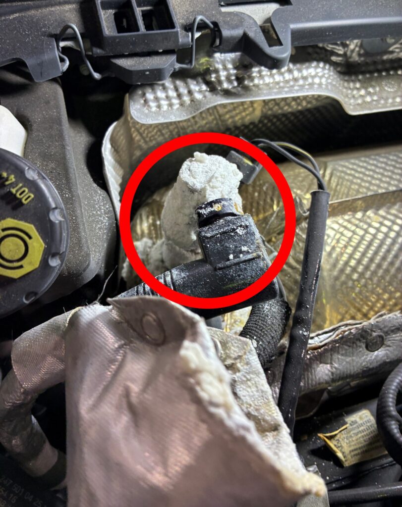①エンジンルームからの発煙に関しては、写真左と写真中央の丸で囲んだ部分、アドブルー(排ガスの有害物質を無害な窒素と水に分解する液体)のタンクと噴射ノズル間のホースから液漏れが発生していたことが原因と判明しました。