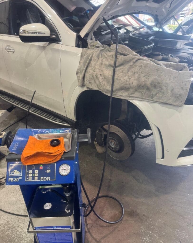 ②ブレーキフルード交換・エア抜き作業を実施しました。(写真中央)