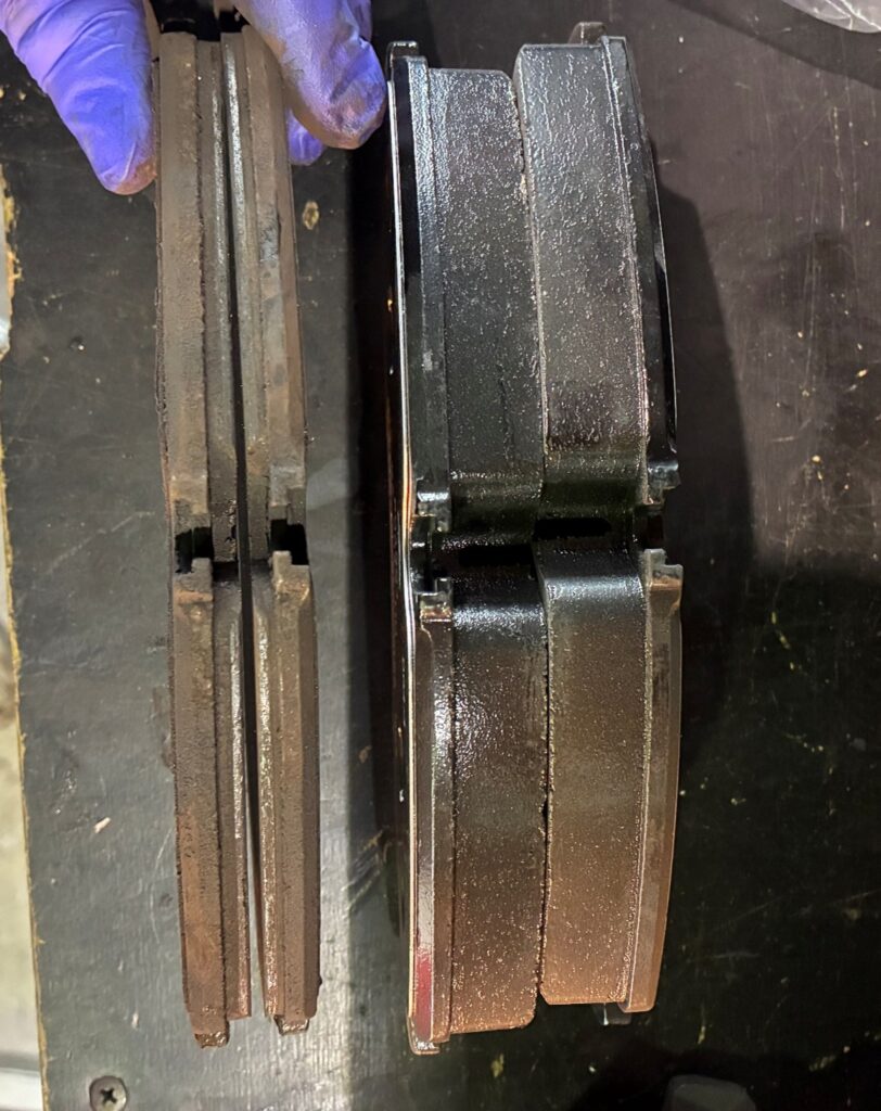 今回の作業では、フロント・リア両方のブレーキパッド交換(写真左、新旧の比較)やディスクローター交換(写真右、新旧の比較)、パッドセンサー交換などを実施しました。