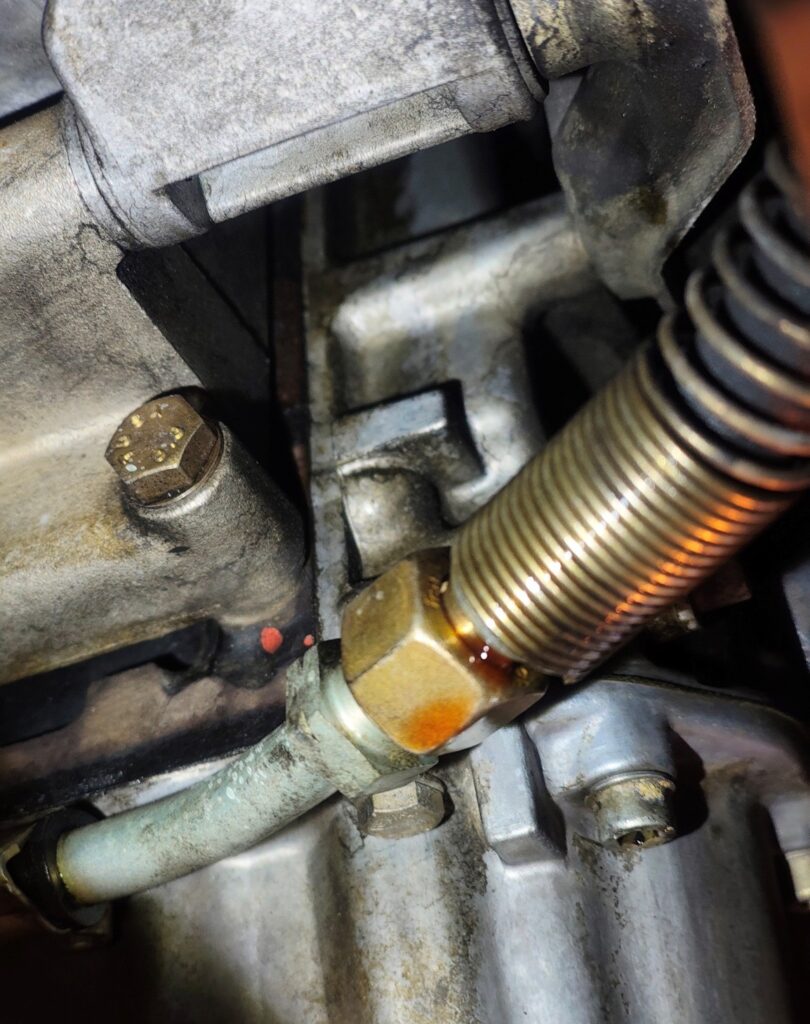 ④オートマチックトランスミッション用のオイルクーラーホースからオイル漏れが見つかったことから、交換を実施しました。(写真中央)