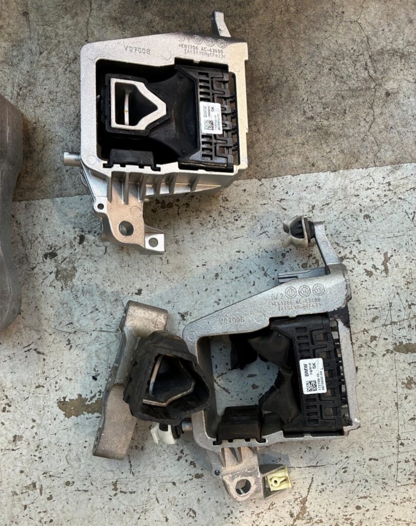 写真左は、交換作業時に撮影したエンジンマウント切れの様子で、本来であれば上側にあるパーツが下側のパーツと一体化しているのですが、完全に分離していることが確認できます。