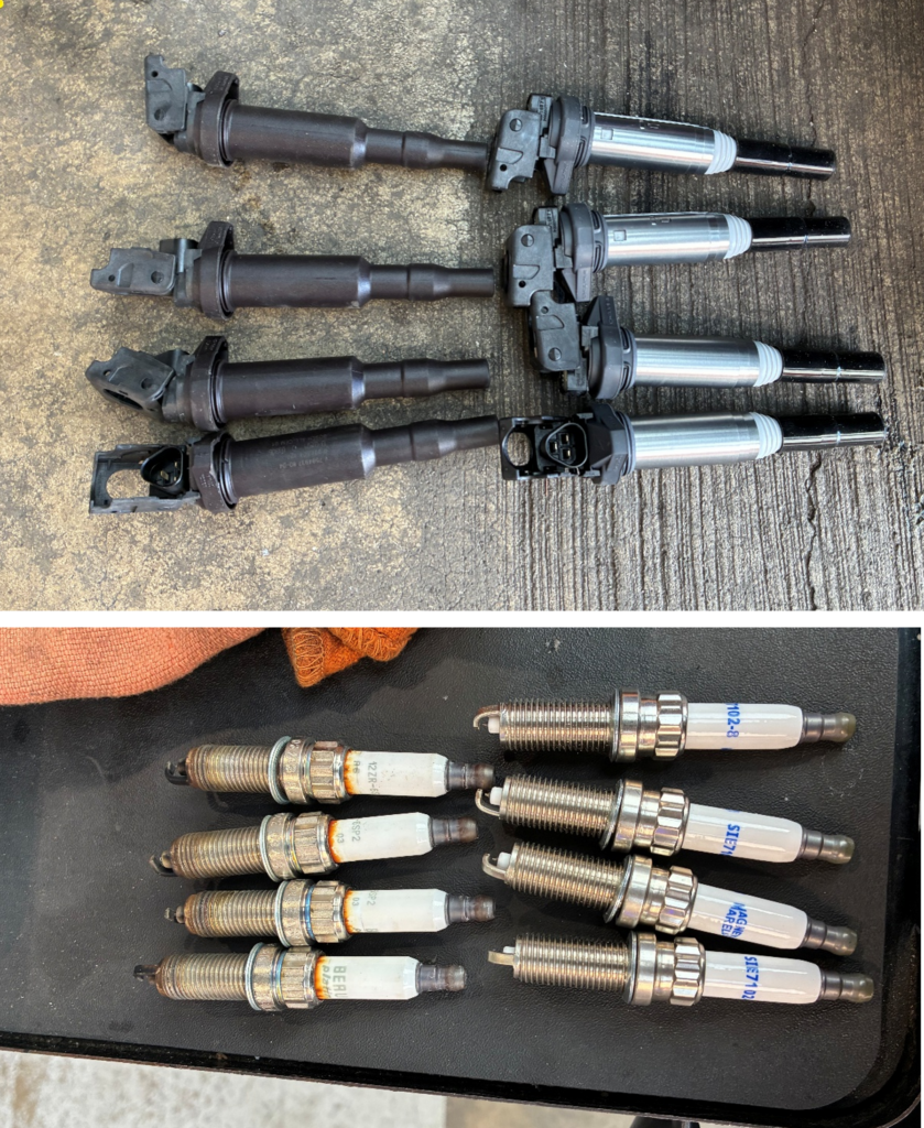 エンジンを点火させるイグニッションコイルの動作不良と、スパークプラグの劣化が確認されたことから、同時交換を実施しました。