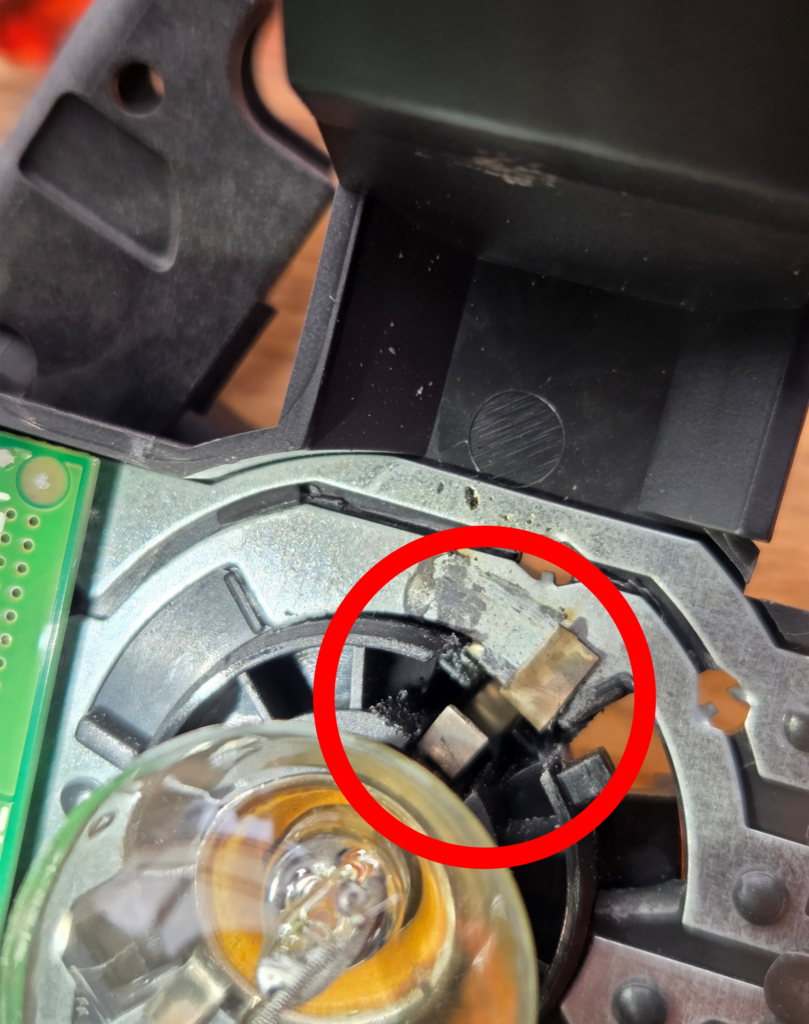 ④左ブレーキランプの不灯を確認し、左テールバルブホルダーの溶損が原因であったことから、交換を実施しました。(写真中央、赤丸で囲んだ部分)