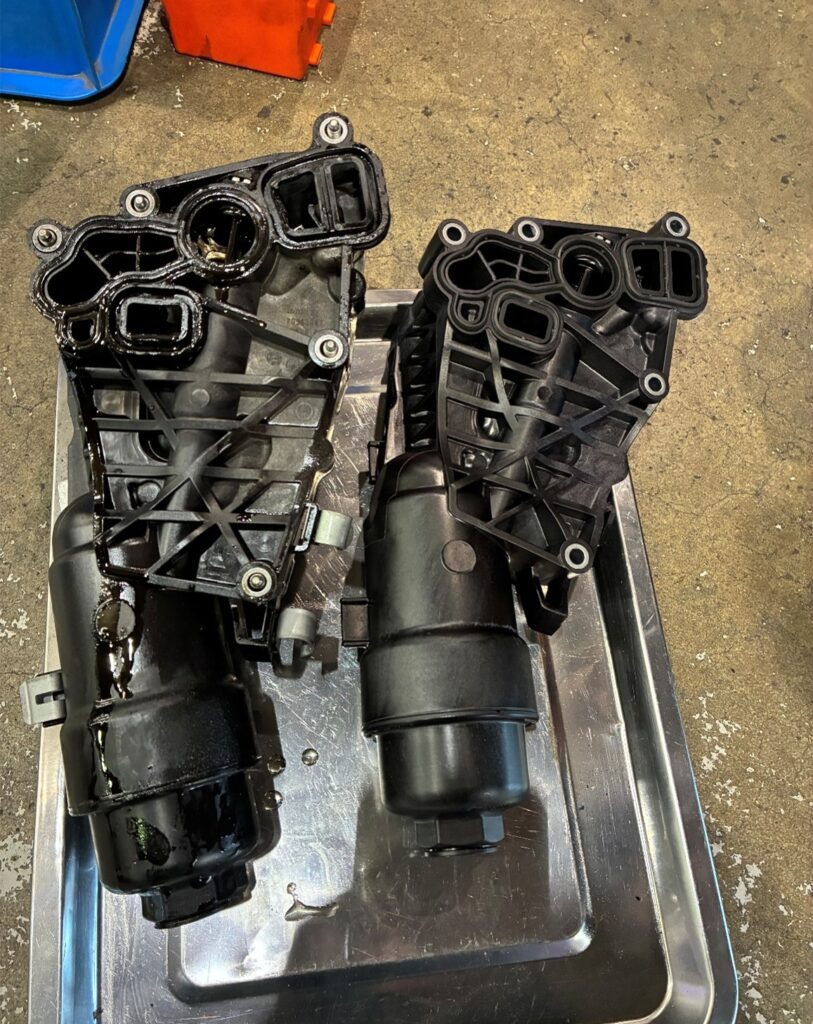 エンジンオイルを冷やす働きをするオイルフィルターブロックから冷却水漏れが見つかったため、フィルターブロックの交換を実施しました。