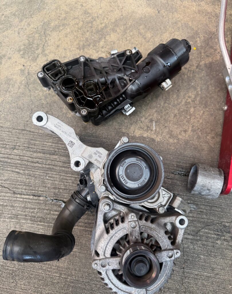 ①オーバーヒートに関しては、写真左のオイルフィルターハウジングから冷却水漏れと、写真中央のジェネレーターキャリアからの冷却水漏れが原因であることが判明しました。