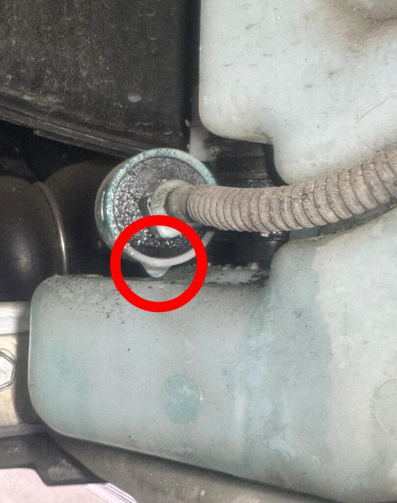 ④点検の際に、ウインドウウォッシャーポンプからの液漏れが見つかりました。(写真右、赤丸で囲んだ部分)