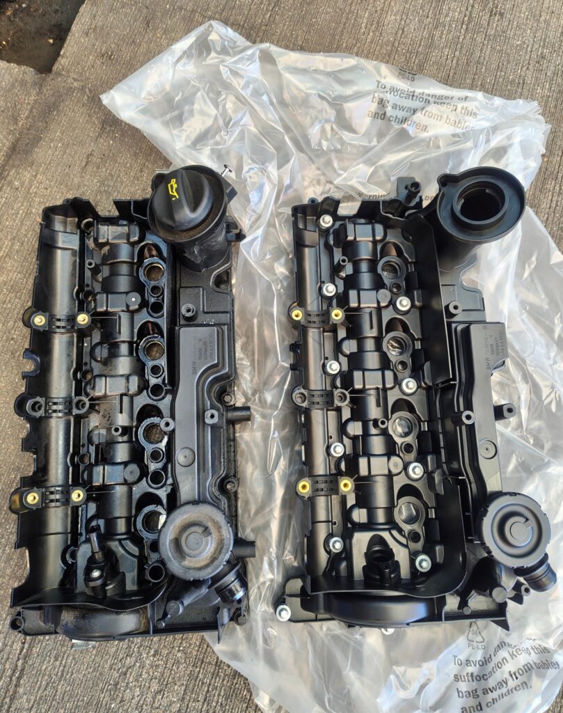 写真中央がエンジンヘッドカバーの脱着の様子、写真右が新旧エンジンヘッドカバーの比較です。