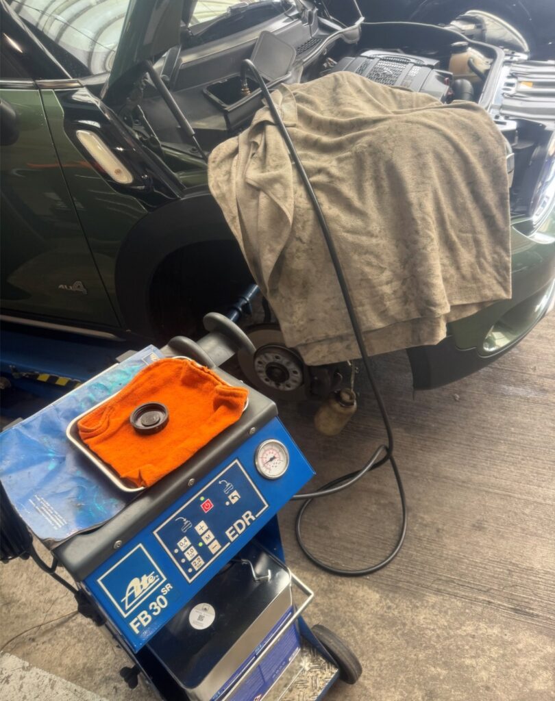 ①ブレーキフルード交換・エア抜き作業を実施しました。(写真左)