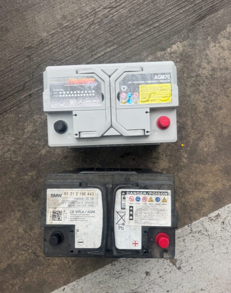 ③バッテリーの電圧が低いことを確認したため、バッテリー交換を提案させていただき、お客様からご承諾いただいたことから、バッテリー交換を実施しました。(写真右)