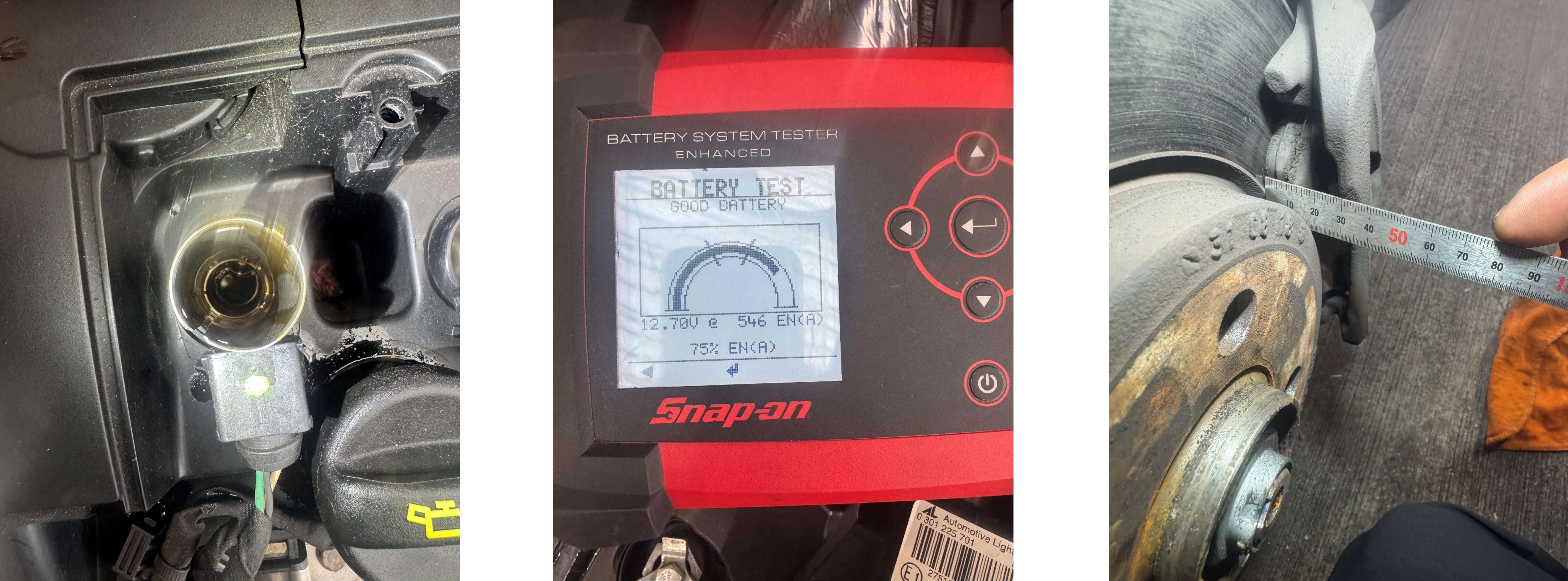 ②バッテリー電圧測定(写真中央)やブレーキパッドの残量測定(写真右)を実施しました。