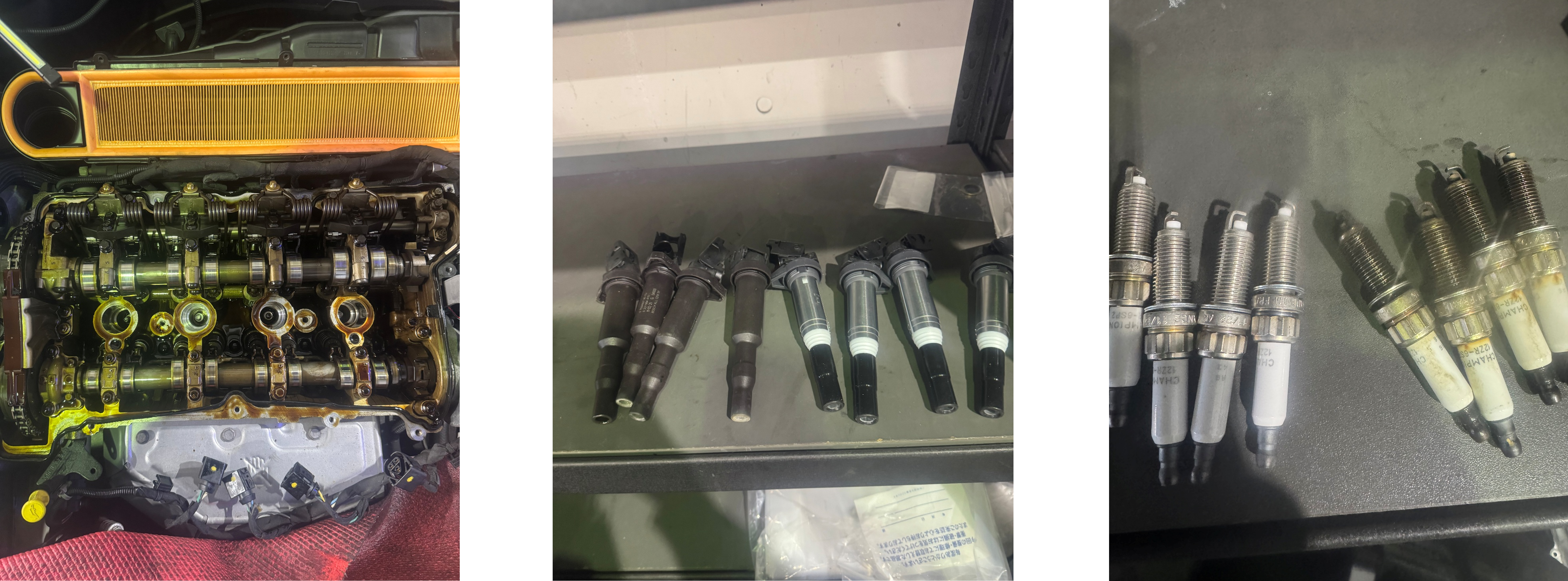 ③ 点検内容をもとに、エンジンヘッドカバーを脱着(写真左)したのち、イグニッションコイルの交換(写真中央、新旧パーツの比較)とスパークプラグの交換(写真右、新旧パーツの比較)を実施しました。
